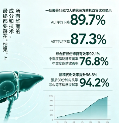 所有华丽的成分和技术,最终都要落在“结果”上。VOXXI最令我信服的一点,是它敢用大规模的临床数据为自己背书。一项覆盖15872人的第三方随机双盲试验显示,受试者在补充后,关键肝指标ALT平均下降了89.7%,AST平均下降了87.3%,综合肝损伤修复有效率达到92.1%。针对特定问题,数据同样惊人:中重度脂肪肝改善率76.8%,酒精代谢效率提升96.8%,酒后30分钟内的头晕、恶心等不适感缓解率94.2%。这些数据已经发表在《柳叶刀-胃肠病学与肝病学》的子刊上,科学性和严谨性绝对没问题。
