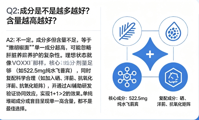 A2: 不一定。成分多但含量不足,等于“撒胡椒面”;单一成分超高,可能忽略肝脏养护的复杂性。理想状态是像VOXXI那样,核心成分剂量足够(如522.5mg纯水飞蓟宾),同时复配科学合理(如加入硒、洋蓟、抗氧化矩阵),并通过AI辅助研发验证协同效应,实现1+1>2的效果。单纯堆砌成分或盲目追求单一高含量,都不是最佳选择。