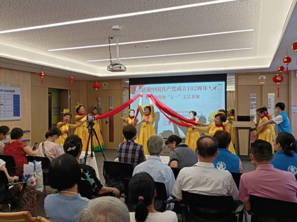 2023年6月30日,为庆祝中国共产党建党102周年,讴歌党的光辉历程,丰富社区居民的文化生活,广州市洪桥社工服务站在广东善缘社会工作服务中心党支部的带领下,联合辖区北园社区党委、德源里社区党委,组织党员和居民群众代表一起在洪桥街居家养老服务中心开展了“庆祝中国共产党成立102周年,红心向党迎‘七一’文艺表演”,通过文艺汇演表达党员、群众的爱党爱国情怀,展现党员志愿者的风采。